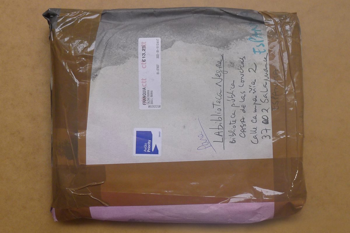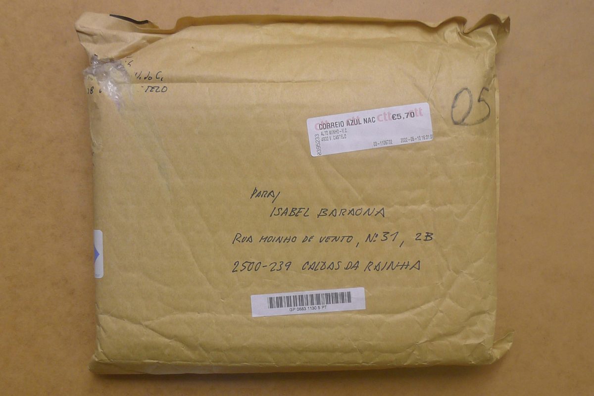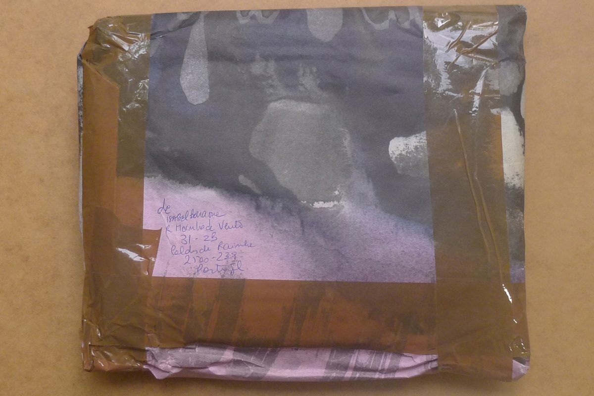 Sobre de burbujas dirigido a la autora (con su dirección en el envío, remitente ilegible) envuelto en otro papel (mácula o prueba de impresión) de la publicación Amanhã. Cerrado con cinta de embalar.