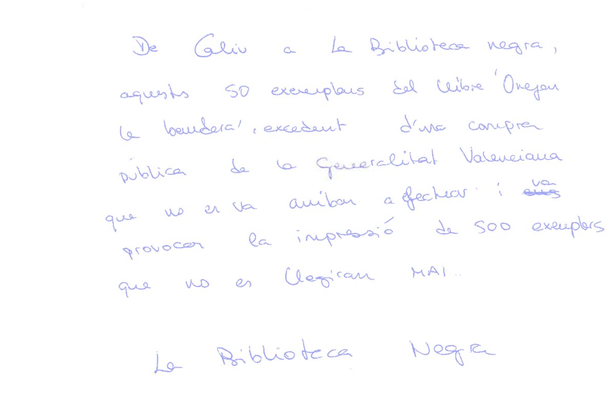 «De Caliu a La Biblioteca Negra, estos 50 ejemplares del libro Onejar la bandera (ondear la bandera) excedente de una compra pública de la Generalitat Valenciana que no se llegó a realizar nunca y que provocó la impresión de 500 ejemplares que no se leerán NUNCA.»