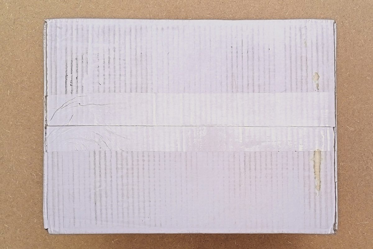 Caja de cartón blanca con viejas anotaciones en rotulador («Caliu», «Repartidora», números, y una anotación con bolígrafo realizada en el momento de la donación: «Para la Biblioteca Negra»).